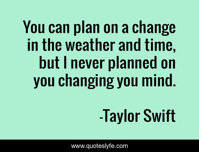 This page presents the quote "You can plan on a change in the weather and time, but I never planned on you changing you mind.". Author of this quote is Taylor Swift. This quote is about last-kiss, lyrics, heart-break, mind, hurt, planning, hopelessness, truth, time,.