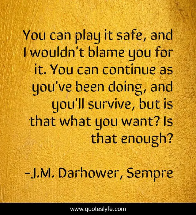 This page presents the quote "You can play it safe, and I wouldn't blame you for it. You can continue as you've been doing, and you'll survive, but is that what you want? Is that enough?". Author of this quote is J.M. Darhower, Sempre. This quote is about life-questions, survive, life, safe, sempre,.