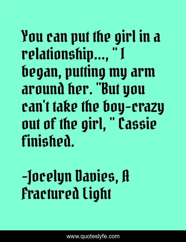 This page presents the quote "You can put the girl in a relationship..., " I began, putting my arm around her. "But you can't take the boy-crazy out of the girl, " Cassie finished.". Author of this quote is Jocelyn Davies, A Fractured Light. This quote is about relationships, a-beautiful-dark, girls, a-fractured-light, skye, boy-crazy, friends, cassie,.