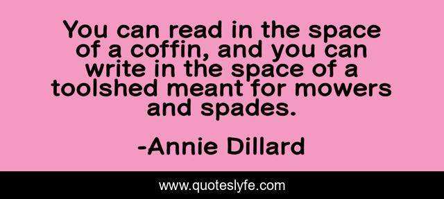 This page presents the quote "You can read in the space of a coffin, and you can write in the space of a toolshed meant for mowers and spades.". Author of this quote is Annie Dillard. This quote is about the-writing-life, reading, author, space, writer, personal-space, write, reads, annie-dillard,.