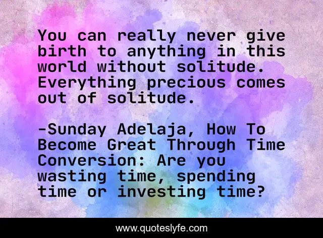This page presents the quote "You can really never give birth to anything in this world without solitude. Everything precious comes out of solitude.". Author of this quote is Sunday Adelaja, How To Become Great Through Time Conversion: Are you wasting time, spending time or investing time?. This quote is about great, solitu, productivity, wealth, gift, work, life, convert, value,.