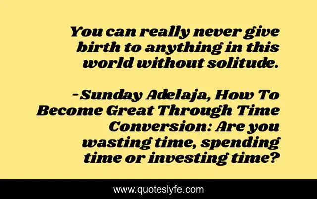 This page presents the quote "You can really never give birth to anything in this world without solitude.". Author of this quote is Sunday Adelaja, How To Become Great Through Time Conversion: Are you wasting time, spending time or investing time?. This quote is about great, solitude, productivity, wealth, gift, work, life, convert, value,.