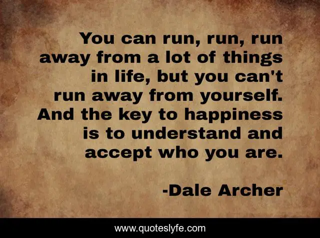 This page presents the quote "You can run, run, run away from a lot of things in life, but you can't run away from yourself. And the key to happiness is to understand and accept who you are.". Author of this quote is Dale Archer. This quote is about life, yourself,.