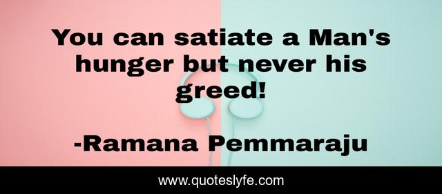 This page presents the quote "You can satiate a Man's hunger but never his greed!". Author of this quote is Ramana Pemmaraju. This quote is about satiate, greedy-corruption, hunger, society, mankind, greed-of-man, greed,.
