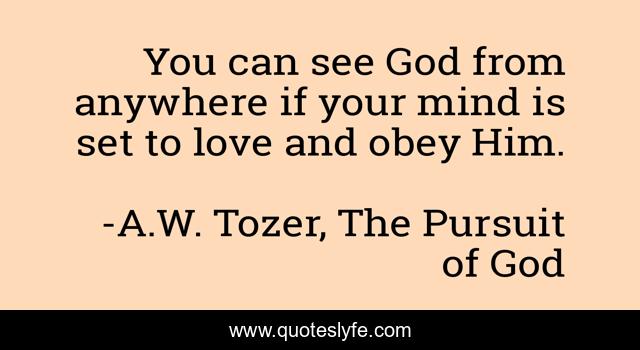 This page presents the quote "You can see God from anywhere if your mind is set to love and obey Him.". Author of this quote is A.W. Tozer, The Pursuit of God. This quote is about god, love, everywhere, affection,.