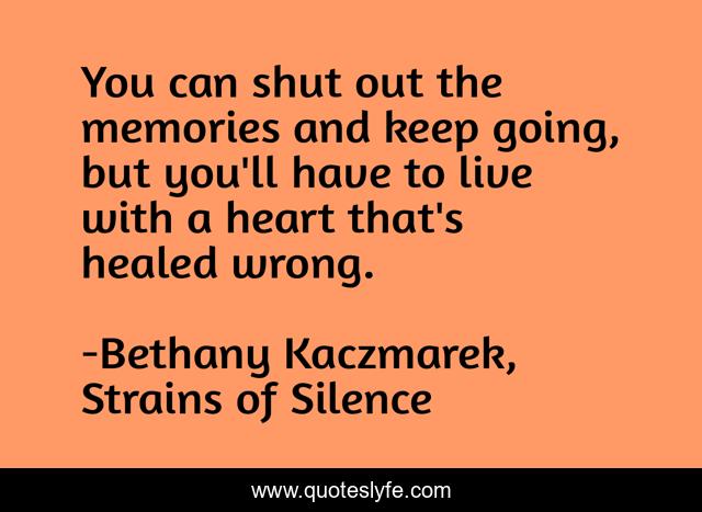 This page presents the quote "You can shut out the memories and keep going, but you'll have to live with a heart that's healed wrong.". Author of this quote is Bethany Kaczmarek, Strains of Silence. This quote is about heart, grit, healing, love, grace, affection,.