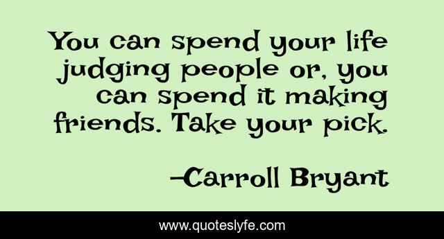 This page presents the quote "You can spend your life judging people or, you can spend it making friends. Take your pick.". Author of this quote is Carroll Bryant. This quote is about philisophy-life, human-behavior, human-nature, humanism, humankind, love, friendship, affection,.
