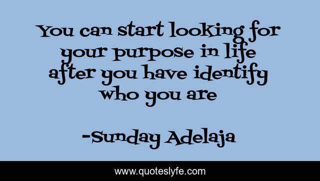 This page presents the quote "You can start looking for your purpose in life after you have identify who you are". Author of this quote is Sunday Adelaja. This quote is about self-discovery, life, purpose, identity, discovery,.