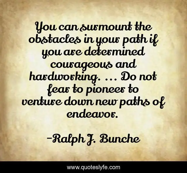 This page presents the quote "You can surmount the obstacles in your path if you are determined courageous and hardworking. ... Do not fear to pioneer to venture down new paths of endeavor.". Author of this quote is Ralph J. Bunche. .