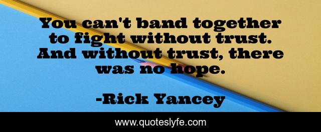 This page presents the quote "You can't band together to fight without trust. And without trust, there was no hope.". Author of this quote is Rick Yancey. This quote is about trust, hope,.
