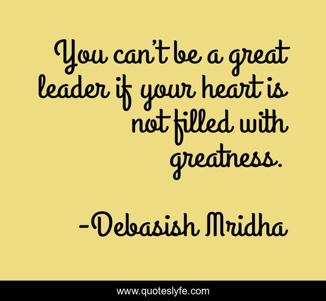 This page presents the quote "You can’t be a great leader if your heart is not filled with greatness.". Author of this quote is Debasish Mridha. This quote is about debasish-mridha, philosophy, how-to-be-a-leader, quotes, leadership, inspirational, be-a-great-leader, enthusiasm, debasish-mridha-m-d,.
