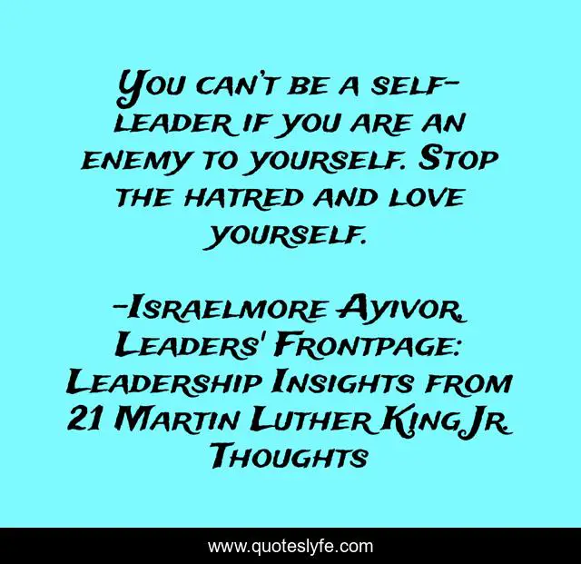 This page presents the quote "You can’t be a self-leader if you are an enemy to yourself. Stop the hatred and love yourself.". Author of this quote is Israelmore Ayivor, Leaders' Frontpage: Leadership Insights from 21 Martin Luther King Jr. Thoughts. This quote is about enemy, food-for-thought, martin-luther, love, leaders, martin-luther-king-jr, self-leader, love-yourself, martin-luther-king,.
