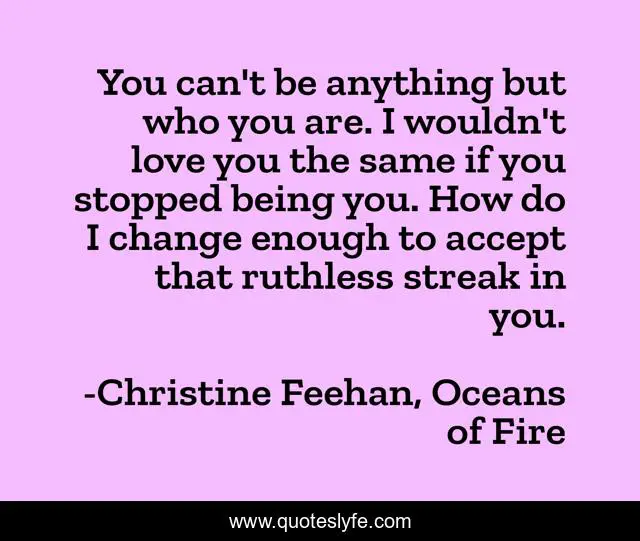 This page presents the quote "You can't be anything but who you are. I wouldn't love you the same if you stopped being you. How do I change enough to accept that ruthless streak in you.". Author of this quote is Christine Feehan, Oceans of Fire. This quote is about accept, love, change, affection,.