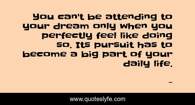 This page presents the quote "You can't be attending to your dream only when you perfectly feel like doing so. Its pursuit has to become a big part of your daily life.". Author of this quote is . This quote is about attennd-to-your-dream, goal, edmond-mbiaka, your-daily-life, the-pursuit-of-your-dream, attending-to-your-dream, working-on-your-dream, goals, your-dream-has-to-consume-you,.