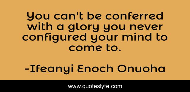 This page presents the quote "You can't be conferred with a glory you never configured your mind to come to.". Author of this quote is Ifeanyi Enoch Onuoha. This quote is about life, great-soul, glory, highsight, quote, insight, mentality, success, positive-thinking,.
