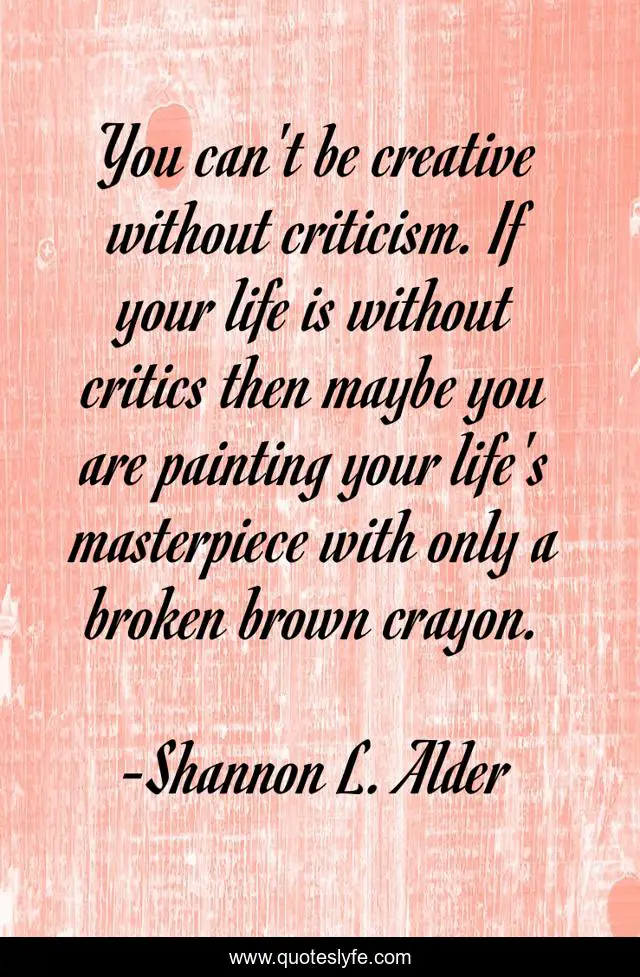 This page presents the quote "You can't be creative without criticism. If your life is without critics then maybe you are painting your life's masterpiece with only a broken brown crayon.". Author of this quote is Shannon L. Alder. This quote is about achievements, criticism, crayons, humor, dream-big, success, ambitions, critics, lack-of-criticism,.