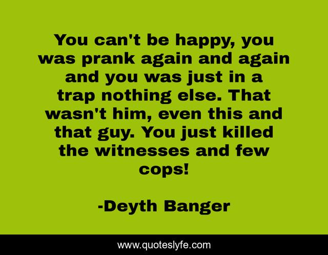 This page presents the quote "You can't be happy, you was prank again and again and you was just in a trap nothing else. That wasn't him, even this and that guy. You just killed the witnesses and few cops!". Author of this quote is Deyth Banger. This quote is about again, else, cops, guy, happy, killed, prank,.