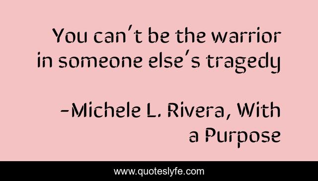 This page presents the quote "You can’t be the warrior in someone else’s tragedy". Author of this quote is Michele L. Rivera, With a Purpose. This quote is about fighting-for-truth, courage, love-hurts,.