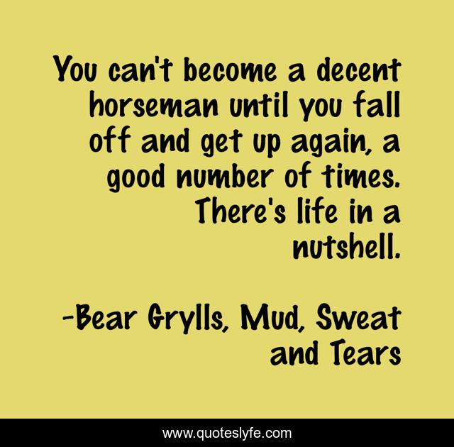This page presents the quote "You can't become a decent horseman until you fall off and get up again, a good number of times. There's life in a nutshell.". Author of this quote is Bear Grylls, Mud, Sweat and Tears. This quote is about living, life, never-giving-up, horse, inspirational, enthusiasm, falling,.