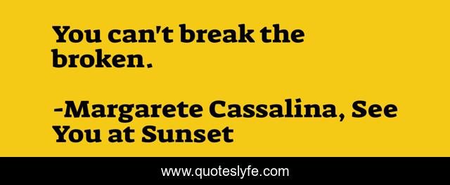 This page presents the quote "You can't break the broken.". Author of this quote is Margarete Cassalina, See You at Sunset. This quote is about fiction-novel, quotes, quotes-about-life,.