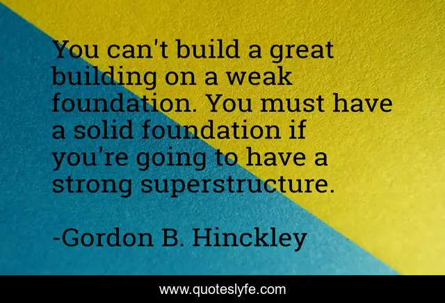 This page presents the quote "You can't build a great building on a weak foundation. You must have a solid foundation if you're going to have a strong superstructure.". Author of this quote is Gordon B. Hinckley. This quote is about building, foundation, strong,.