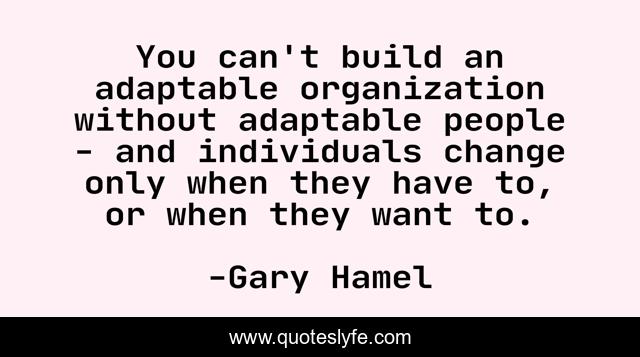 This page presents the quote "You can't build an adaptable organization without adaptable people - and individuals change only when they have to, or when they want to.". Author of this quote is Gary Hamel. This quote is about organization, people,.