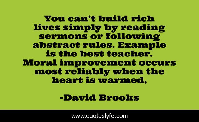 This page presents the quote "You can’t build rich lives simply by reading sermons or following abstract rules. Example is the best teacher. Moral improvement occurs most reliably when the heart is warmed, ". Author of this quote is David Brooks. This quote is about discipleship, character,.