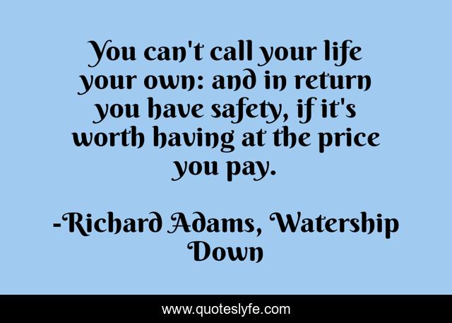 This page presents the quote "You can't call your life your own: and in return you have safety, if it's worth having at the price you pay.". Author of this quote is Richard Adams, Watership Down. This quote is about politics, government, freedom,.