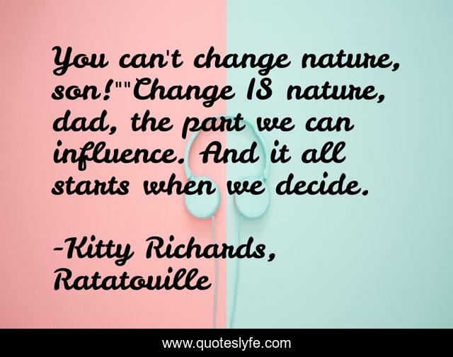 This page presents the quote "You can't change nature, son!""Change IS nature, dad, the part we can influence. And it all starts when we decide.". Author of this quote is Kitty Richards, Ratatouille. This quote is about nature, influence, change, ratatouille,.