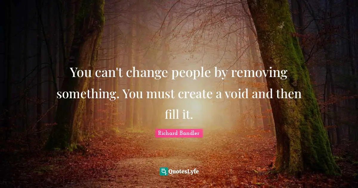 This page presents the quote "You can't change people by removing something. You must create a void and then fill it.". Author of this quote is Richard Bandler. This quote is about you can't change people, can't change, people, void,.