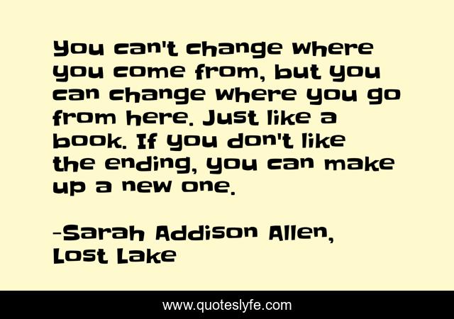 This page presents the quote "You can't change where you come from, but you can change where you go from here. Just like a book. If you don't like the ending, you can make up a new one.". Author of this quote is Sarah Addison Allen, Lost Lake. This quote is about the-future, outlook, destiny, change, hope, perspective,.