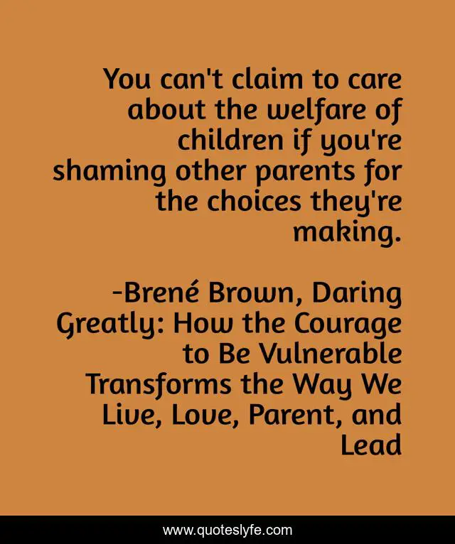 This page presents the quote "You can't claim to care about the welfare of children if you're shaming other parents for the choices they're making.". Author of this quote is Brené Brown, Daring Greatly: How the Courage to Be Vulnerable Transforms the Way We Live, Love, Parent, and Lead. This quote is about child, choices, shaming, parents, welfare, children,.