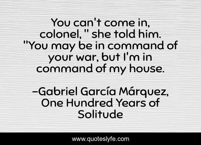 This page presents the quote "You can't come in, colonel, " she told him. "You may be in command of your war, but I'm in command of my house.". Author of this quote is Gabriel García Márquez, One Hundred Years of Solitude. This quote is about authority, spite,.