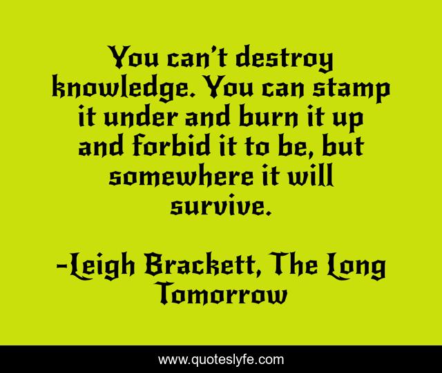 "Leigh Brackett, The Long Tomorrow Quotes." Quoteslyfe.com, 2025. Fri. 05 Dec. 2025. <https://www.quoteslyfe.com/quote/You-can-t-destroy-knowledge-You-can-30694>.