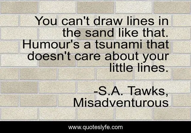 This page presents the quote "You can't draw lines in the sand like that. Humour's a tsunami that doesn't care about your little lines.". Author of this quote is S.A. Tawks, Misadventurous. This quote is about funny, humor, humour, joke, humourous, comedy,.