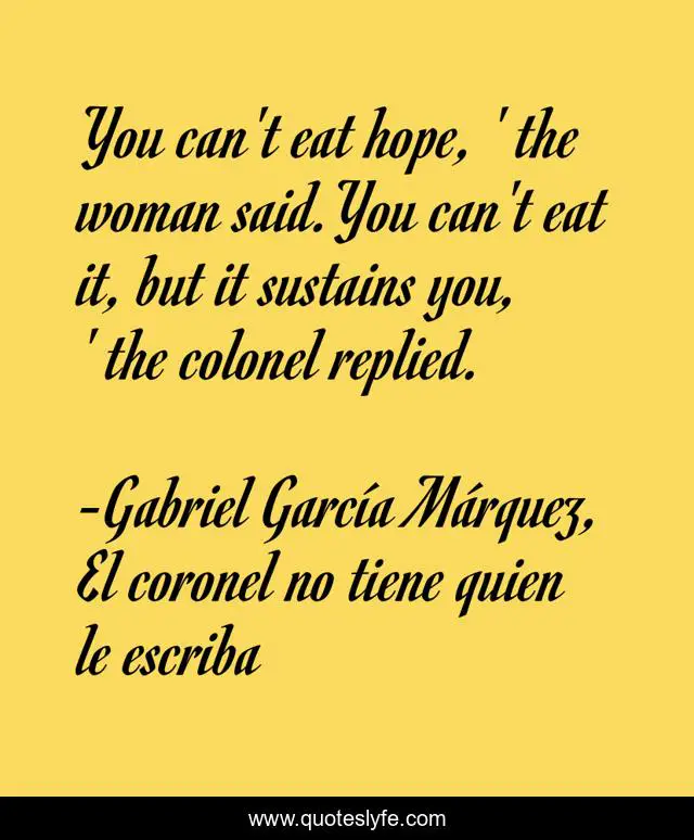 "Gabriel García Márquez, El coronel no tiene quien le escriba Quotes." Quoteslyfe.com, 2025. Sun. 07 Dec. 2025. <https://www.quoteslyfe.com/quote/You-can-t-eat-hope-the-woman-19225>.