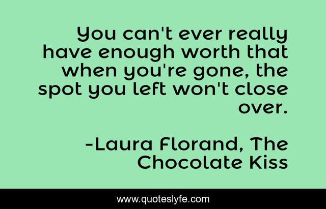 This page presents the quote "You can't ever really have enough worth that when you're gone, the spot you left won't close over.". Author of this quote is Laura Florand, The Chocolate Kiss. This quote is about solitude, pessimism, worth, worthiness, worthlessness,.