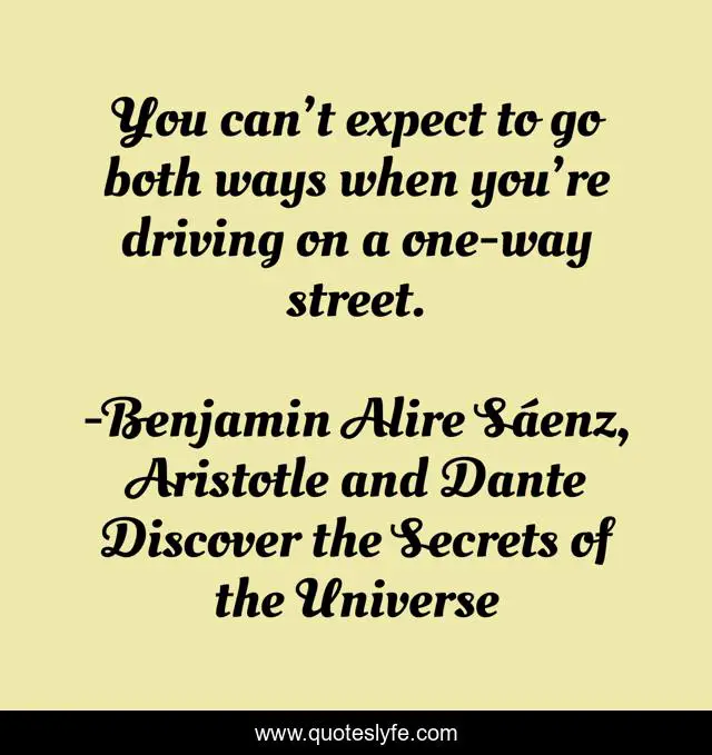 This page presents the quote "You can’t expect to go both ways when you’re driving on a one-way street.". Author of this quote is Benjamin Alire Sáenz, Aristotle and Dante Discover the Secrets of the Universe. This quote is about driving-lessons, life-lessons,.