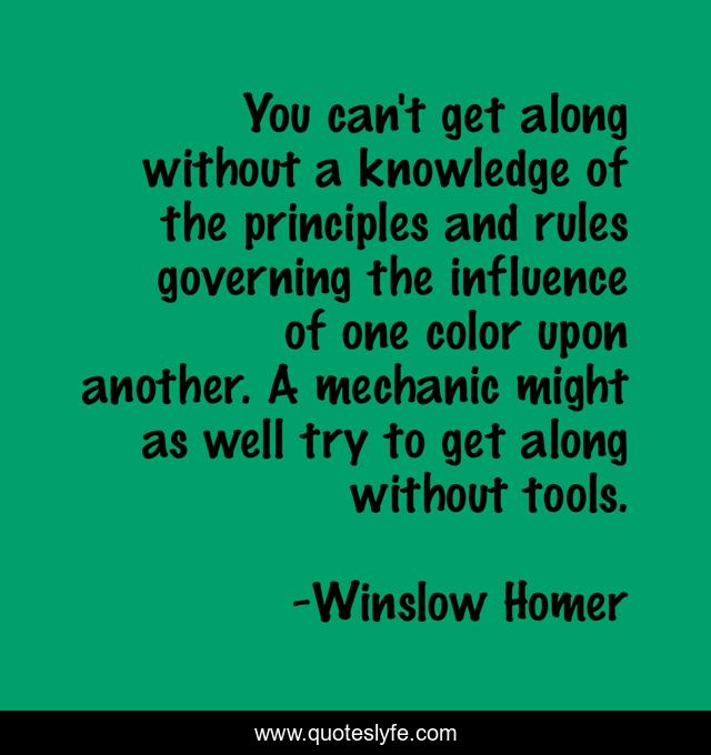 This page presents the quote "You can't get along without a knowledge of the principles and rules governing the influence of one color upon another. A mechanic might as well try to get along without tools.". Author of this quote is Winslow Homer. This quote is about color, rules, influence,.