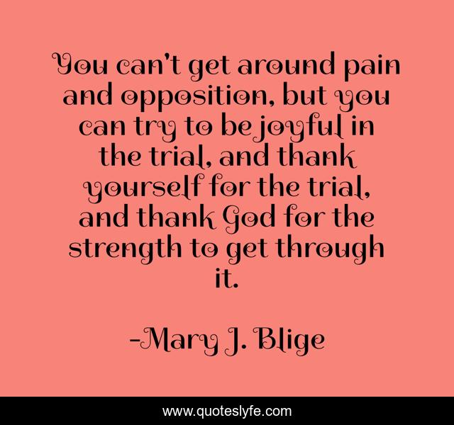 This page presents the quote "You can't get around pain and opposition, but you can try to be joyful in the trial, and thank yourself for the trial, and thank God for the strength to get through it.". Author of this quote is Mary J. Blige. This quote is about god, pain, yourself,.