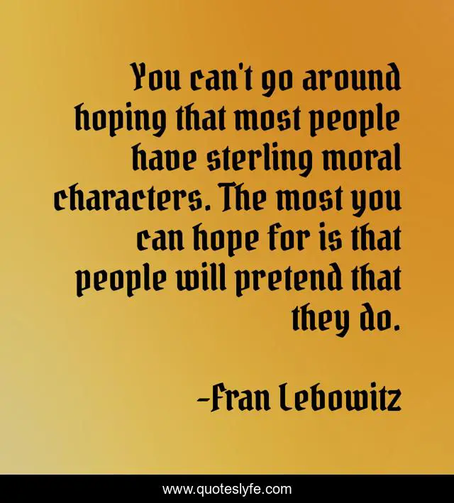 This page presents the quote "You can't go around hoping that most people have sterling moral characters. The most you can hope for is that people will pretend that they do.". Author of this quote is Fran Lebowitz. This quote is about moral, people,.