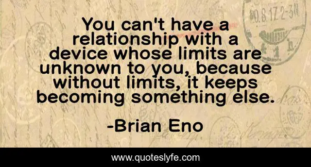 This page presents the quote "You can't have a relationship with a device whose limits are unknown to you, because without limits, it keeps becoming something else.". Author of this quote is Brian Eno. This quote is about unknown, limits,.