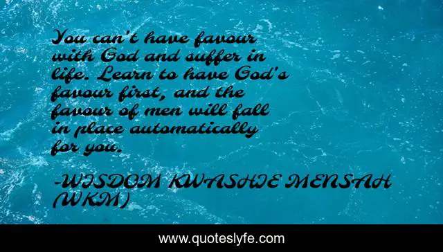 This page presents the quote "You can't have favour with God and suffer in life. Learn to have God's favour first, and the favour of men will fall in place automatically for you.". Author of this quote is WISDOM KWASHIE MENSAH (WKM). This quote is about wkm, optimistic, men-s-favour, living, confidence, knoledge, positive, favour, winning,.