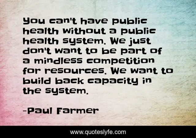 This page presents the quote "You can't have public health without a public health system. We just don't want to be part of a mindless competition for resources. We want to build back capacity in the system.". Author of this quote is Paul Farmer. .