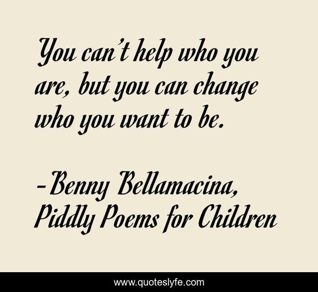 This page presents the quote "You can’t help who you are, but you can change who you want to be.". Author of this quote is Benny Bellamacina, Piddly Poems for Children. This quote is about life, philosophy, wisdom,.