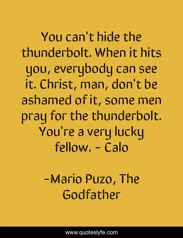 This page presents the quote "You can't hide the thunderbolt. When it hits you, everybody can see it. Christ, man, don't be ashamed of it, some men pray for the thunderbolt. You're a very lucky fellow. - Calo". Author of this quote is Mario Puzo, The Godfather. .