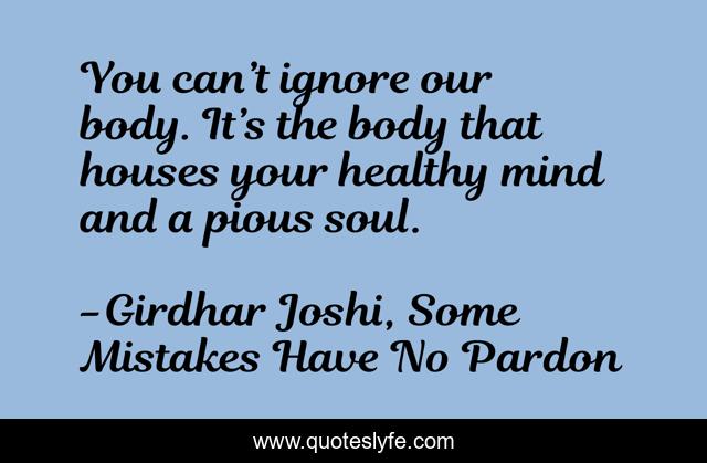 This page presents the quote "You can’t ignore our body. It’s the body that houses your healthy mind and a pious soul.". Author of this quote is Girdhar Joshi, Some Mistakes Have No Pardon. This quote is about body, mind, soul,.