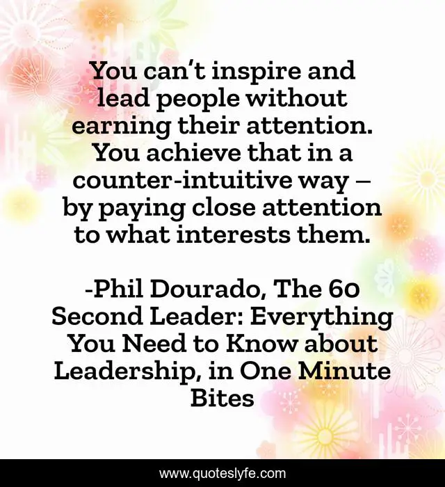 This page presents the quote "You can’t inspire and lead people without earning their attention. You achieve that in a counter-intuitive way – by paying close attention to what interests them.". Author of this quote is Phil Dourado, The 60 Second Leader: Everything You Need to Know about Leadership, in One Minute Bites. This quote is about engagement, inspire, lead, leadership-development, work, leadership, attention, employee-engagement, inspiration,.