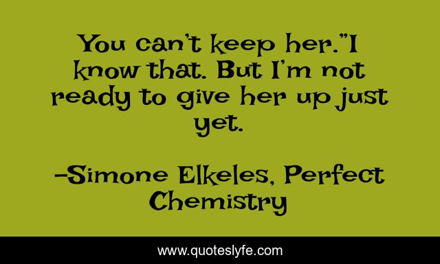 This page presents the quote "You can’t keep her.”I know that. But I’m not ready to give her up just yet.". Author of this quote is Simone Elkeles, Perfect Chemistry. This quote is about romance, young-adult-fiction, young-adult-romance,.