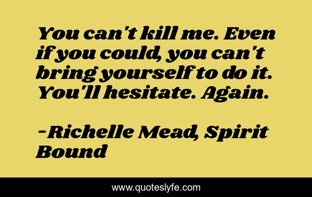 This page presents the quote "You can't kill me. Even if you could, you can't bring yourself to do it. You'll hesitate. Again.". Author of this quote is Richelle Mead, Spirit Bound. This quote is about murder, hesitation, weakness, death, kill, inability, mistake,.